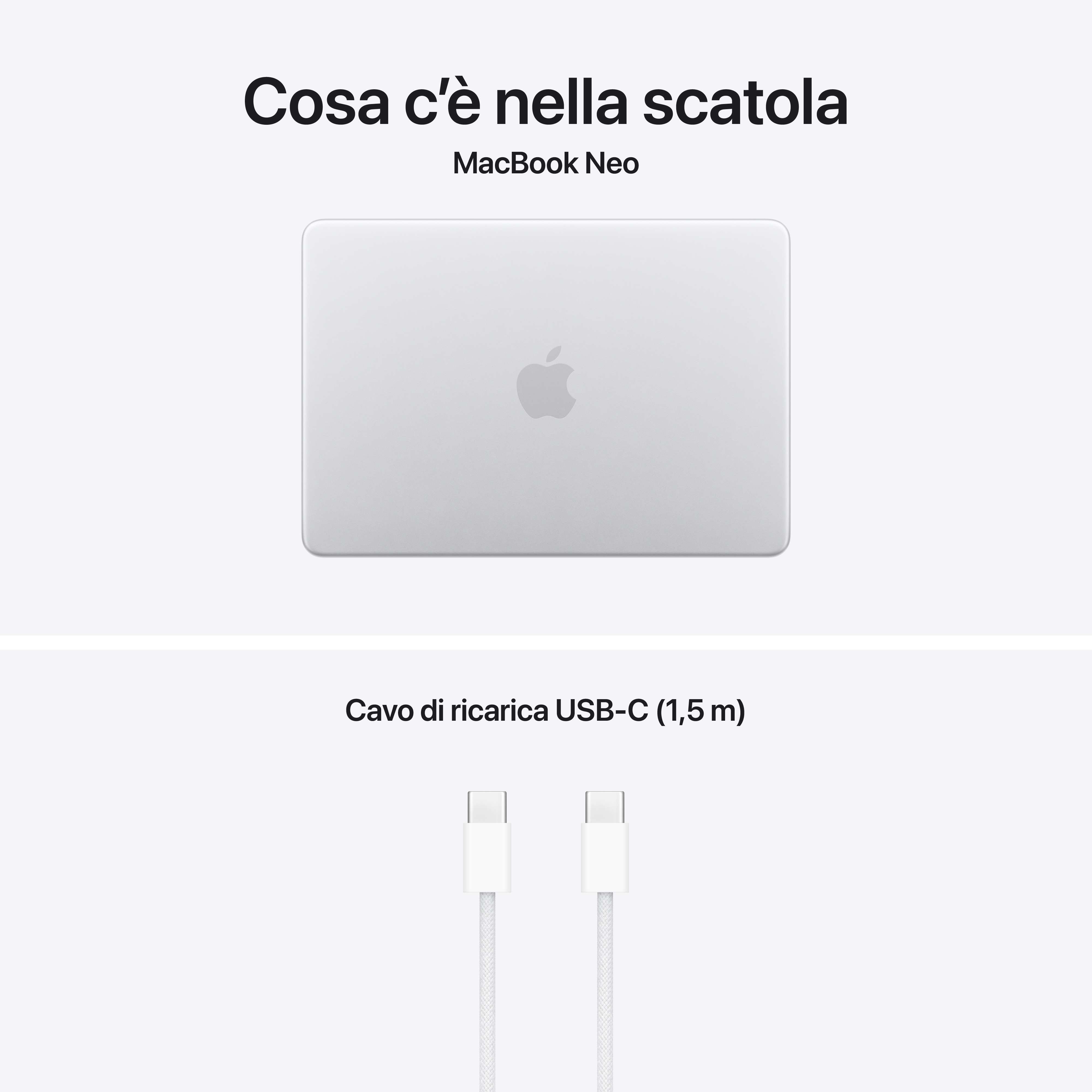 IllustrazioneMacBook Neo. Un Mac eccezionale. A un prezzo che non ti aspetti. Pronto ad affrontare ogni giornata insieme a te, MacBook Neo sfreccia tra i task e le app di tutti i giorni. Ha un robusto design in alluminio in quattro splendidi colori, uno spettacolare display Liquid Retina da 13", il chip A18 Pro progettato per l’AI e Apple Intelligence, e fino a 16 ore di autonomia. È un Mac eccezionale, a un prezzo che non ti aspetti. Caratteristiche principali - LA LINEA DI MACBOOK PIÙ VARIOPINTA DI SEMPRE – Scegli tra argento, rosa pastello, giallo agrume e indaco: ciascuno con tastiera in tinta per creare un look coordinato. E grazie al suo robusto design in alluminio, MacBook Neo ti segue ovunque. - PRESTAZIONI PER LE ATTIVITÀ QUOTIDIANE – Sin da subito, MacBook Neo con il chip A18 Pro offre performance e funzioni AI che ti aiutano a fare tutto in scioltezza: ritoccare le foto di famiglia, lavorare con i fogli di calcolo, riassumere gli appunti delle lezioni con l’AI, o lanciarti nell’ultimo gioco di Apple Arcade. - FINO A 16 ORE DI AUTONOMIA – Con una batteria che dura una giornata intera, MacBook Neo è pronto a seguirti nelle tue attività quotidiane e negli studi, dalle lezioni del mattino alle maratone notturne prima dell’esame. - SPETTACOLARE DISPLAY DA 13" — Lo splendido display Liquid Retina è una gioia per gli occhi. Con una risoluzione di 2408×1506 pixel, fino a 500 nit di luminosità e il supporto per un miliardo di colori, le immagini sono brillanti e il testo nitidissimo. - FATTI VEDERE E SENTIRE ALLA GRANDE — MacBook Neo ha una videocamera FaceTime HD a 1080p, due microfoni in array che rendono più chiara la tua voce durante le chiamate, e due altoparlanti a diffusione laterale con audio spaziale per offrirti un suono avvolgente. - PROGETTATO PER L’AI – Il chip Apple e i suoi principali componenti sono progettati per gestire in modo efficiente le attività AI on device. Apple Intelligence rende più facile scrivere, creare e fare tutto ciò che vuoi, con funzioni di ultima generazione per la tutela della privacy. - MACOS METTE IL TURBO ALLE APP – Su macOS le tue app preferite vanno a tutta velocità, comprese quelle di serie come FaceTime e Messaggi. - SE AMI IL TUO IPHONE, AMERAI ANCHE IL MAC – Il Mac funziona in perfetta sintonia con gli altri dispositivi Apple. Puoi copiare e incollare dall’iPhone al Mac, e usare il Mac per inviare messaggi di testo o rispondere alle chiamate FaceTime. - PRIVACY E SICUREZZA — La protezione antivirus integrata e gli aggiornamenti software gratuiti aiutano a mantenere il tuo MacBook Neo sicuro e perfettamente efficiente. FileVault protegge i tuoi file con la crittografia, così solo tu potrai accedervi. Se perdi il tuo Mac o ti viene rubato, l’app Dov’è può aiutarti a ritrovarlo. Sul modello di MacBook Neo con tasto Blocco, ti basta premerlo per riattivare e bloccare lo schermo e accendere o spegnere il Mac. E sul modello con Touch ID, puoi usare la tua impronta digitale per sbloccare il Mac, autorizzare i pagamenti, e accedere alle app e ai siti web. - ALIMENTATORI – N.B. MacBook Neo include un cavo di ricarica USB C senza alimentatore. Per ricaricare questo dispositivo è necessario un alimentatore USB C o un’altra fonte di alimentazione USB PD da almeno 20W. Per una ricarica ottimale, Apple consiglia l’alimentatore USB C Apple da 20W.
