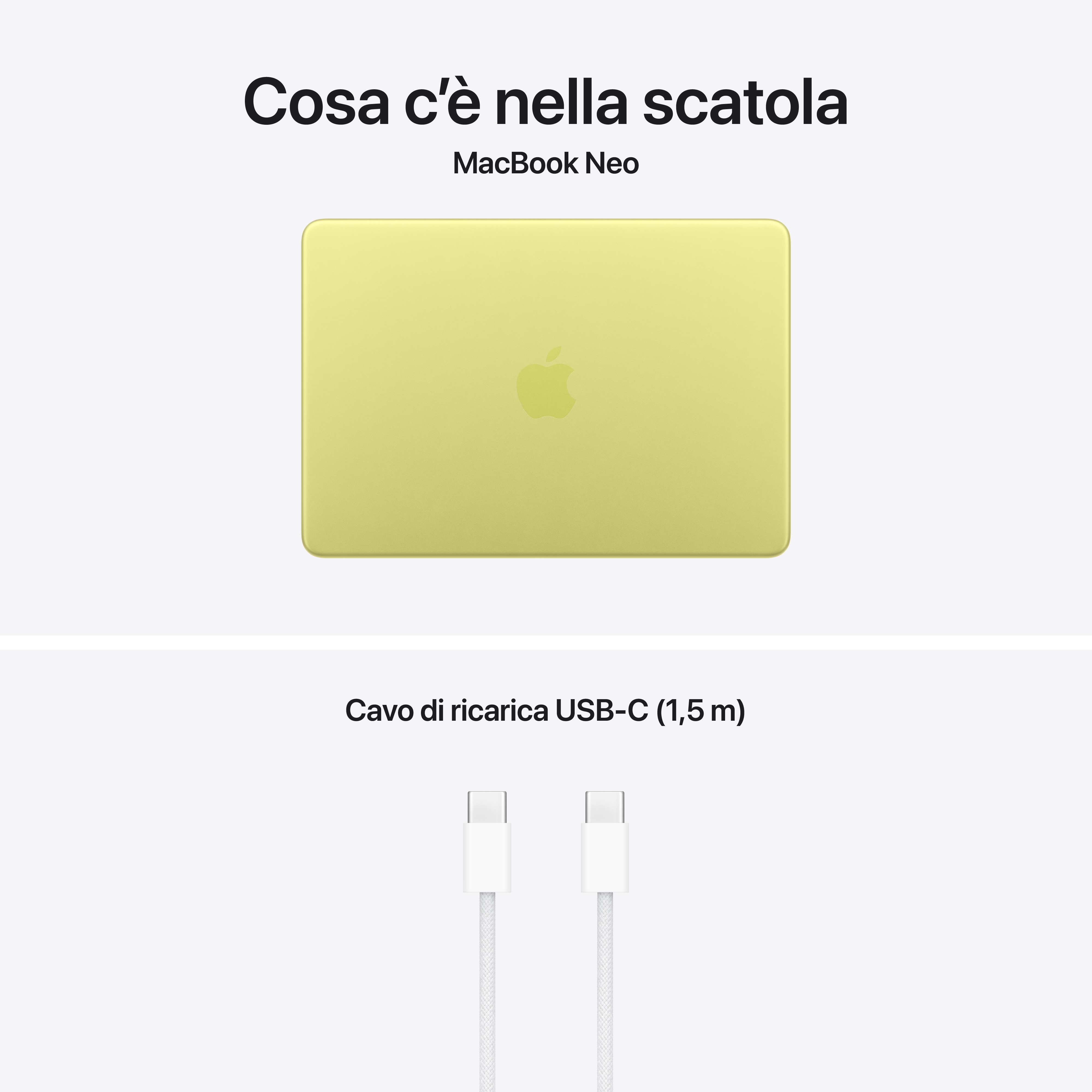 | Illustrazione | MacBook Neo. Un Mac eccezionale. A un prezzo che non ti aspetti. Pronto ad affrontare ogni giornata insieme a te, MacBook Neo sfreccia tra i task e le app di tutti i giorni. Ha un robusto design in alluminio in quattro splendidi colori, uno spettacolare display Liquid Retina da 13", il chip A18 Pro progettato per l’AI e Apple Intelligence, e fino a 16 ore di autonomia. È un Mac eccezionale, a un prezzo che non ti aspetti. Caratteristiche principali - LA LINEA DI MACBOOK PIÙ VARIOPINTA DI SEMPRE – Scegli tra argento, rosa pastello, giallo agrume e indaco: ciascuno con tastiera in tinta per creare un look coordinato. E grazie al suo robusto design in alluminio, MacBook Neo ti segue ovunque. - PRESTAZIONI PER LE ATTIVITÀ QUOTIDIANE – Sin da subito, MacBook Neo con il chip A18 Pro offre performance e funzioni AI che ti aiutano a fare tutto in scioltezza: ritoccare le foto di famiglia, lavorare con i fogli di calcolo, riassumere gli appunti delle lezioni con l’AI, o lanciarti nell’ultimo gioco di Apple Arcade. - FINO A 16 ORE DI AUTONOMIA – Con una batteria che dura una giornata intera, MacBook Neo è pronto a seguirti nelle tue attività quotidiane e negli studi, dalle lezioni del mattino alle maratone notturne prima dell’esame. - SPETTACOLARE DISPLAY DA 13" — Lo splendido display Liquid Retina è una gioia per gli occhi. Con una risoluzione di 2408×1506 pixel, fino a 500 nit di luminosità e il supporto per un miliardo di colori, le immagini sono brillanti e il testo nitidissimo. - FATTI VEDERE E SENTIRE ALLA GRANDE — MacBook Neo ha una videocamera FaceTime HD a 1080p, due microfoni in array che rendono più chiara la tua voce durante le chiamate, e due altoparlanti a diffusione laterale con audio spaziale per offrirti un suono avvolgente. - PROGETTATO PER L’AI – Il chip Apple e i suoi principali componenti sono progettati per gestire in modo efficiente le attività AI on device. Apple Intelligence rende più facile scrivere, creare e fare tutto ciò che vuoi, con funzioni di ultima generazione per la tutela della privacy. - MACOS METTE IL TURBO ALLE APP – Su macOS le tue app preferite vanno a tutta velocità, comprese quelle di serie come FaceTime e Messaggi. - SE AMI IL TUO IPHONE, AMERAI ANCHE IL MAC – Il Mac funziona in perfetta sintonia con gli altri dispositivi Apple. Puoi copiare e incollare dall’iPhone al Mac, e usare il Mac per inviare messaggi di testo o rispondere alle chiamate FaceTime. - PRIVACY E SICUREZZA — La protezione antivirus integrata e gli aggiornamenti software gratuiti aiutano a mantenere il tuo MacBook Neo sicuro e perfettamente efficiente. FileVault protegge i tuoi file con la crittografia, così solo tu potrai accedervi. Se perdi il tuo Mac o ti viene rubato, l’app Dov’è può aiutarti a ritrovarlo. Sul modello di MacBook Neo con tasto Blocco, ti basta premerlo per riattivare e bloccare lo schermo e accendere o spegnere il Mac. E sul modello con Touch ID, puoi usare la tua impronta digitale per sbloccare il Mac, autorizzare i pagamenti, e accedere alle app e ai siti web. - ALIMENTATORI – N.B. MacBook Neo include un cavo di ricarica USB C senza alimentatore. Per ricaricare questo dispositivo è necessario un alimentatore USB C o un’altra fonte di alimentazione USB PD da almeno 20W. Per una ricarica ottimale, Apple consiglia l’alimentatore USB C Apple da 20W. |