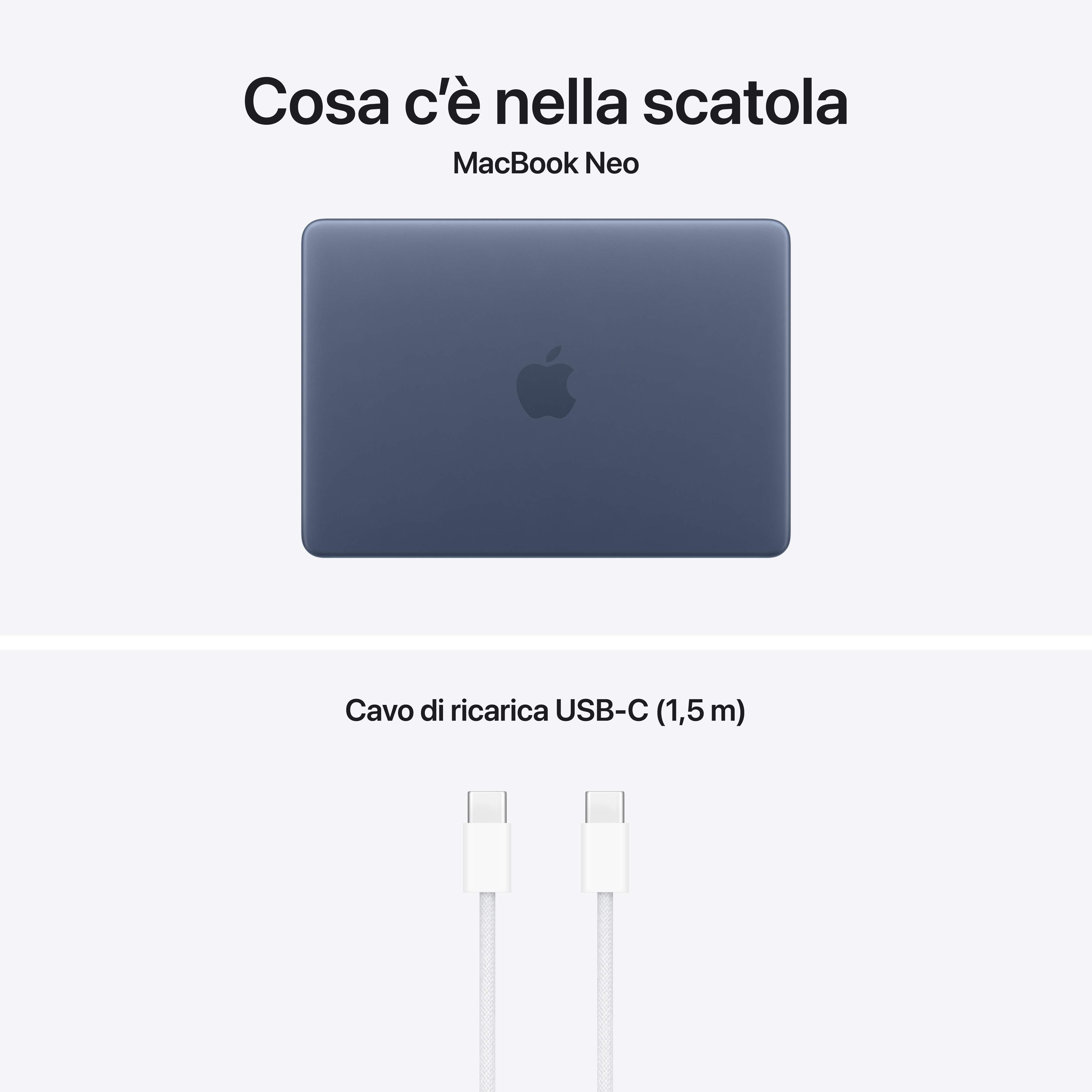 | Illustrazione | MacBook Neo. Un Mac eccezionale. A un prezzo che non ti aspetti. Pronto ad affrontare ogni giornata insieme a te, MacBook Neo sfreccia tra i task e le app di tutti i giorni. Ha un robusto design in alluminio in quattro splendidi colori, uno spettacolare display Liquid Retina da 13", il chip A18 Pro progettato per l’AI e Apple Intelligence, e fino a 16 ore di autonomia. È un Mac eccezionale, a un prezzo che non ti aspetti. Caratteristiche principali - LA LINEA DI MACBOOK PIÙ VARIOPINTA DI SEMPRE – Scegli tra argento, rosa pastello, giallo agrume e indaco: ciascuno con tastiera in tinta per creare un look coordinato. E grazie al suo robusto design in alluminio, MacBook Neo ti segue ovunque. - PRESTAZIONI PER LE ATTIVITÀ QUOTIDIANE – Sin da subito, MacBook Neo con il chip A18 Pro offre performance e funzioni AI che ti aiutano a fare tutto in scioltezza: ritoccare le foto di famiglia, lavorare con i fogli di calcolo, riassumere gli appunti delle lezioni con l’AI, o lanciarti nell’ultimo gioco di Apple Arcade. - FINO A 16 ORE DI AUTONOMIA – Con una batteria che dura una giornata intera, MacBook Neo è pronto a seguirti nelle tue attività quotidiane e negli studi, dalle lezioni del mattino alle maratone notturne prima dell’esame. - SPETTACOLARE DISPLAY DA 13" — Lo splendido display Liquid Retina è una gioia per gli occhi. Con una risoluzione di 2408×1506 pixel, fino a 500 nit di luminosità e il supporto per un miliardo di colori, le immagini sono brillanti e il testo nitidissimo. - FATTI VEDERE E SENTIRE ALLA GRANDE — MacBook Neo ha una videocamera FaceTime HD a 1080p, due microfoni in array che rendono più chiara la tua voce durante le chiamate, e due altoparlanti a diffusione laterale con audio spaziale per offrirti un suono avvolgente. - PROGETTATO PER L’AI – Il chip Apple e i suoi principali componenti sono progettati per gestire in modo efficiente le attività AI on device. Apple Intelligence rende più facile scrivere, creare e fare tutto ciò che vuoi, con funzioni di ultima generazione per la tutela della privacy. - MACOS METTE IL TURBO ALLE APP – Su macOS le tue app preferite vanno a tutta velocità, comprese quelle di serie come FaceTime e Messaggi. - SE AMI IL TUO IPHONE, AMERAI ANCHE IL MAC – Il Mac funziona in perfetta sintonia con gli altri dispositivi Apple. Puoi copiare e incollare dall’iPhone al Mac, e usare il Mac per inviare messaggi di testo o rispondere alle chiamate FaceTime. - PRIVACY E SICUREZZA — La protezione antivirus integrata e gli aggiornamenti software gratuiti aiutano a mantenere il tuo MacBook Neo sicuro e perfettamente efficiente. FileVault protegge i tuoi file con la crittografia, così solo tu potrai accedervi. Se perdi il tuo Mac o ti viene rubato, l’app Dov’è può aiutarti a ritrovarlo. Sul modello di MacBook Neo con tasto Blocco, ti basta premerlo per riattivare e bloccare lo schermo e accendere o spegnere il Mac. E sul modello con Touch ID, puoi usare la tua impronta digitale per sbloccare il Mac, autorizzare i pagamenti, e accedere alle app e ai siti web. - ALIMENTATORI – N.B. MacBook Neo include un cavo di ricarica USB C senza alimentatore. Per ricaricare questo dispositivo è necessario un alimentatore USB C o un’altra fonte di alimentazione USB PD da almeno 20W. Per una ricarica ottimale, Apple consiglia l’alimentatore USB C Apple da 20W. |