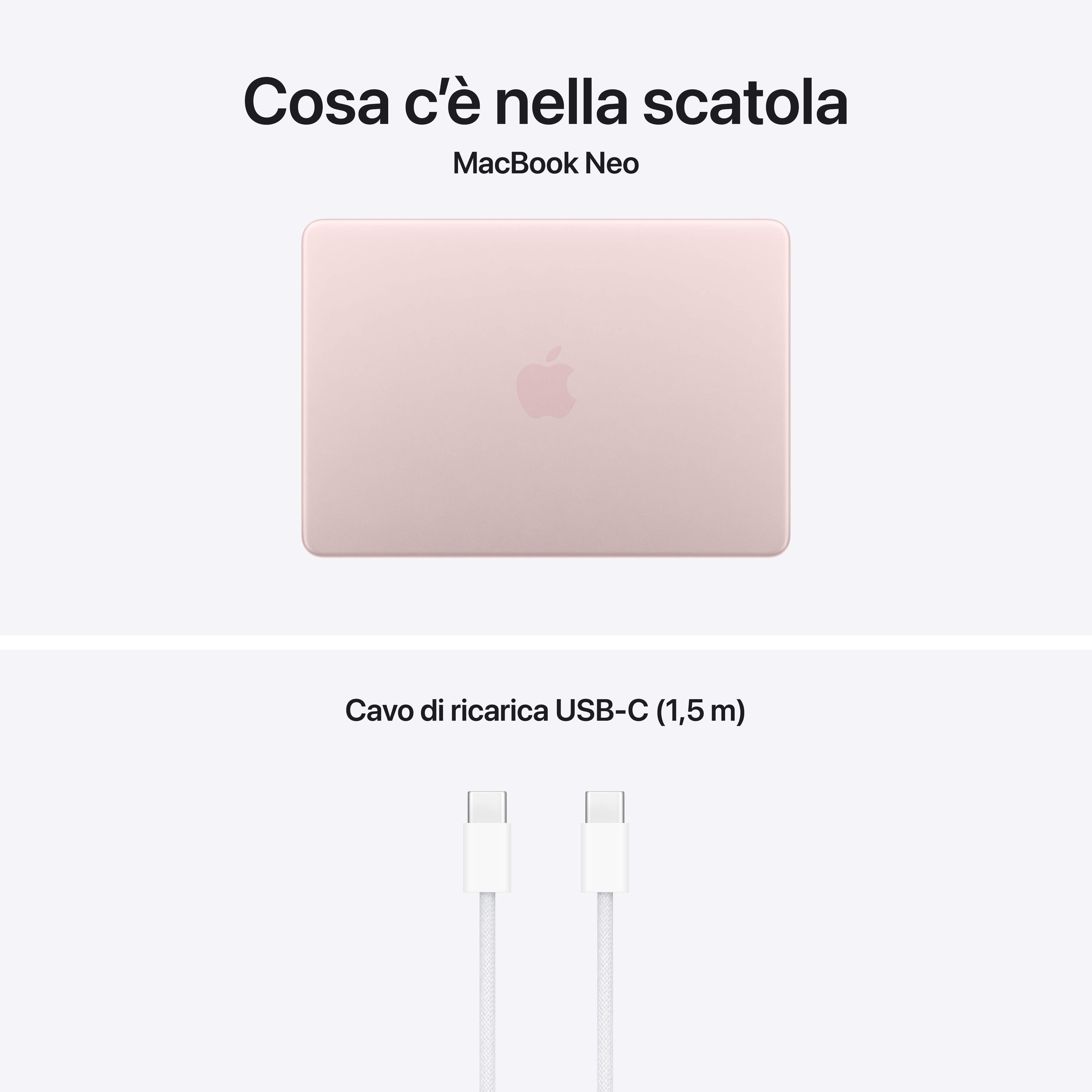 IllustrazioneMacBook Neo. Un Mac eccezionale. A un prezzo che non ti aspetti. Pronto ad affrontare ogni giornata insieme a te, MacBook Neo sfreccia tra i task e le app di tutti i giorni. Ha un robusto design in alluminio in quattro splendidi colori, uno spettacolare display Liquid Retina da 13", il chip A18 Pro progettato per l’AI e Apple Intelligence, e fino a 16 ore di autonomia. È un Mac eccezionale, a un prezzo che non ti aspetti. Caratteristiche principali - LA LINEA DI MACBOOK PIÙ VARIOPINTA DI SEMPRE – Scegli tra argento, rosa pastello, giallo agrume e indaco: ciascuno con tastiera in tinta per creare un look coordinato. E grazie al suo robusto design in alluminio, MacBook Neo ti segue ovunque. - PRESTAZIONI PER LE ATTIVITÀ QUOTIDIANE – Sin da subito, MacBook Neo con il chip A18 Pro offre performance e funzioni AI che ti aiutano a fare tutto in scioltezza: ritoccare le foto di famiglia, lavorare con i fogli di calcolo, riassumere gli appunti delle lezioni con l’AI, o lanciarti nell’ultimo gioco di Apple Arcade. - FINO A 16 ORE DI AUTONOMIA – Con una batteria che dura una giornata intera, MacBook Neo è pronto a seguirti nelle tue attività quotidiane e negli studi, dalle lezioni del mattino alle maratone notturne prima dell’esame. - SPETTACOLARE DISPLAY DA 13" — Lo splendido display Liquid Retina è una gioia per gli occhi. Con una risoluzione di 2408×1506 pixel, fino a 500 nit di luminosità e il supporto per un miliardo di colori, le immagini sono brillanti e il testo nitidissimo. - FATTI VEDERE E SENTIRE ALLA GRANDE — MacBook Neo ha una videocamera FaceTime HD a 1080p, due microfoni in array che rendono più chiara la tua voce durante le chiamate, e due altoparlanti a diffusione laterale con audio spaziale per offrirti un suono avvolgente. - PROGETTATO PER L’AI – Il chip Apple e i suoi principali componenti sono progettati per gestire in modo efficiente le attività AI on device. Apple Intelligence rende più facile scrivere, creare e fare tutto ciò che vuoi, con funzioni di ultima generazione per la tutela della privacy. - MACOS METTE IL TURBO ALLE APP – Su macOS le tue app preferite vanno a tutta velocità, comprese quelle di serie come FaceTime e Messaggi. - SE AMI IL TUO IPHONE, AMERAI ANCHE IL MAC – Il Mac funziona in perfetta sintonia con gli altri dispositivi Apple. Puoi copiare e incollare dall’iPhone al Mac, e usare il Mac per inviare messaggi di testo o rispondere alle chiamate FaceTime. - PRIVACY E SICUREZZA — La protezione antivirus integrata e gli aggiornamenti software gratuiti aiutano a mantenere il tuo MacBook Neo sicuro e perfettamente efficiente. FileVault protegge i tuoi file con la crittografia, così solo tu potrai accedervi. Se perdi il tuo Mac o ti viene rubato, l’app Dov’è può aiutarti a ritrovarlo. Sul modello di MacBook Neo con tasto Blocco, ti basta premerlo per riattivare e bloccare lo schermo e accendere o spegnere il Mac. E sul modello con Touch ID, puoi usare la tua impronta digitale per sbloccare il Mac, autorizzare i pagamenti, e accedere alle app e ai siti web. - ALIMENTATORI – N.B. MacBook Neo include un cavo di ricarica USB C senza alimentatore. Per ricaricare questo dispositivo è necessario un alimentatore USB C o un’altra fonte di alimentazione USB PD da almeno 20W. Per una ricarica ottimale, Apple consiglia l’alimentatore USB C Apple da 20W.