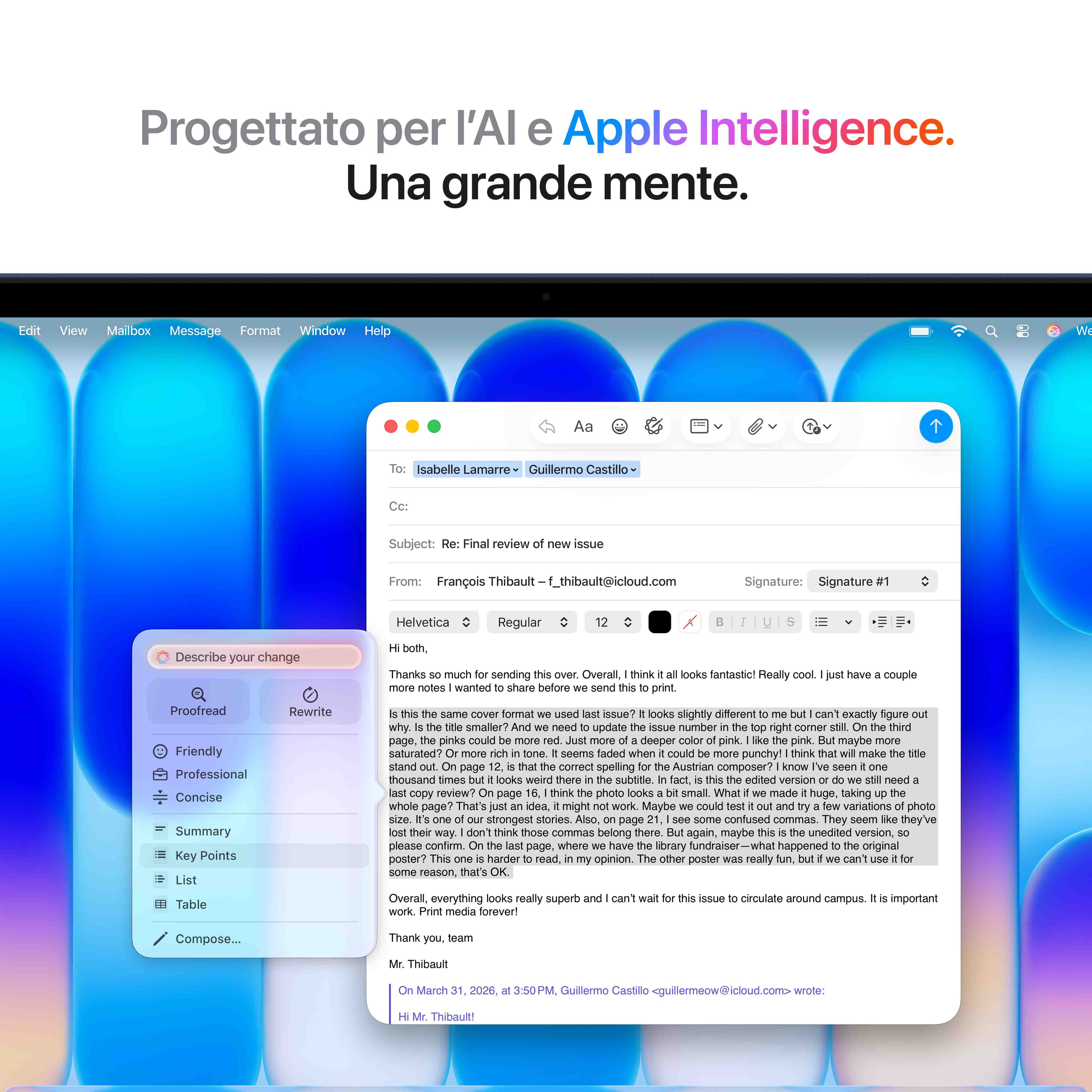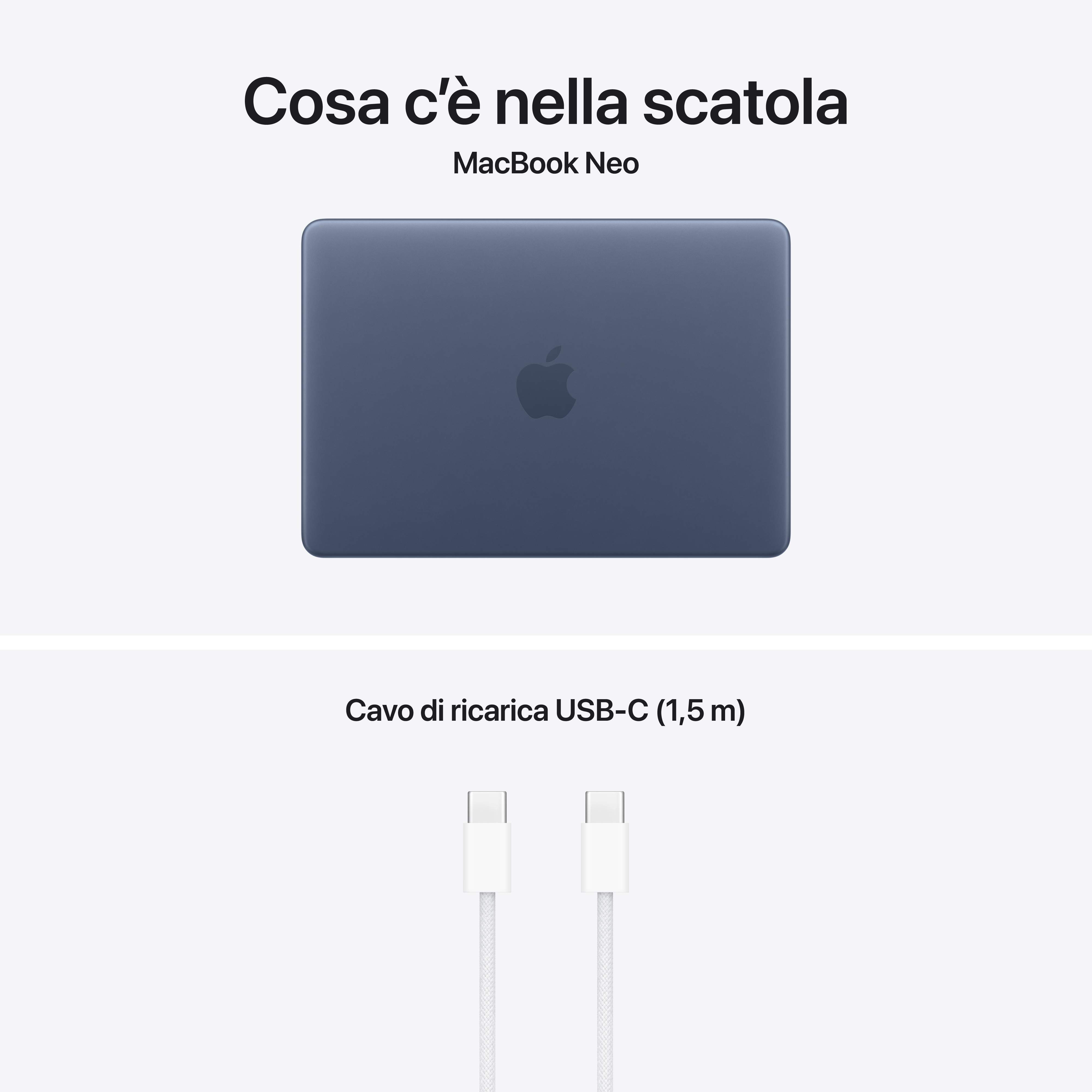 IllustrazioneMacBook Neo. Un Mac eccezionale. A un prezzo che non ti aspetti. Pronto ad affrontare ogni giornata insieme a te, MacBook Neo sfreccia tra i task e le app di tutti i giorni. Ha un robusto design in alluminio in quattro splendidi colori, uno spettacolare display Liquid Retina da 13", il chip A18 Pro progettato per l’AI e Apple Intelligence, e fino a 16 ore di autonomia. È un Mac eccezionale, a un prezzo che non ti aspetti. Caratteristiche principali - LA LINEA DI MACBOOK PIÙ VARIOPINTA DI SEMPRE – Scegli tra argento, rosa pastello, giallo agrume e indaco: ciascuno con tastiera in tinta per creare un look coordinato. E grazie al suo robusto design in alluminio, MacBook Neo ti segue ovunque. - PRESTAZIONI PER LE ATTIVITÀ QUOTIDIANE – Sin da subito, MacBook Neo con il chip A18 Pro offre performance e funzioni AI che ti aiutano a fare tutto in scioltezza: ritoccare le foto di famiglia, lavorare con i fogli di calcolo, riassumere gli appunti delle lezioni con l’AI, o lanciarti nell’ultimo gioco di Apple Arcade. - FINO A 16 ORE DI AUTONOMIA – Con una batteria che dura una giornata intera, MacBook Neo è pronto a seguirti nelle tue attività quotidiane e negli studi, dalle lezioni del mattino alle maratone notturne prima dell’esame. - SPETTACOLARE DISPLAY DA 13" — Lo splendido display Liquid Retina è una gioia per gli occhi. Con una risoluzione di 2408×1506 pixel, fino a 500 nit di luminosità e il supporto per un miliardo di colori, le immagini sono brillanti e il testo nitidissimo. - FATTI VEDERE E SENTIRE ALLA GRANDE — MacBook Neo ha una videocamera FaceTime HD a 1080p, due microfoni in array che rendono più chiara la tua voce durante le chiamate, e due altoparlanti a diffusione laterale con audio spaziale per offrirti un suono avvolgente. - PROGETTATO PER L’AI – Il chip Apple e i suoi principali componenti sono progettati per gestire in modo efficiente le attività AI on device. Apple Intelligence rende più facile scrivere, creare e fare tutto ciò che vuoi, con funzioni di ultima generazione per la tutela della privacy. - MACOS METTE IL TURBO ALLE APP – Su macOS le tue app preferite vanno a tutta velocità, comprese quelle di serie come FaceTime e Messaggi. - SE AMI IL TUO IPHONE, AMERAI ANCHE IL MAC – Il Mac funziona in perfetta sintonia con gli altri dispositivi Apple. Puoi copiare e incollare dall’iPhone al Mac, e usare il Mac per inviare messaggi di testo o rispondere alle chiamate FaceTime. - PRIVACY E SICUREZZA — La protezione antivirus integrata e gli aggiornamenti software gratuiti aiutano a mantenere il tuo MacBook Neo sicuro e perfettamente efficiente. FileVault protegge i tuoi file con la crittografia, così solo tu potrai accedervi. Se perdi il tuo Mac o ti viene rubato, l’app Dov’è può aiutarti a ritrovarlo. Sul modello di MacBook Neo con tasto Blocco, ti basta premerlo per riattivare e bloccare lo schermo e accendere o spegnere il Mac. E sul modello con Touch ID, puoi usare la tua impronta digitale per sbloccare il Mac, autorizzare i pagamenti, e accedere alle app e ai siti web. - ALIMENTATORI – N.B. MacBook Neo include un cavo di ricarica USB C senza alimentatore. Per ricaricare questo dispositivo è necessario un alimentatore USB C o un’altra fonte di alimentazione USB PD da almeno 20W. Per una ricarica ottimale, Apple consiglia l’alimentatore USB C Apple da 20W.