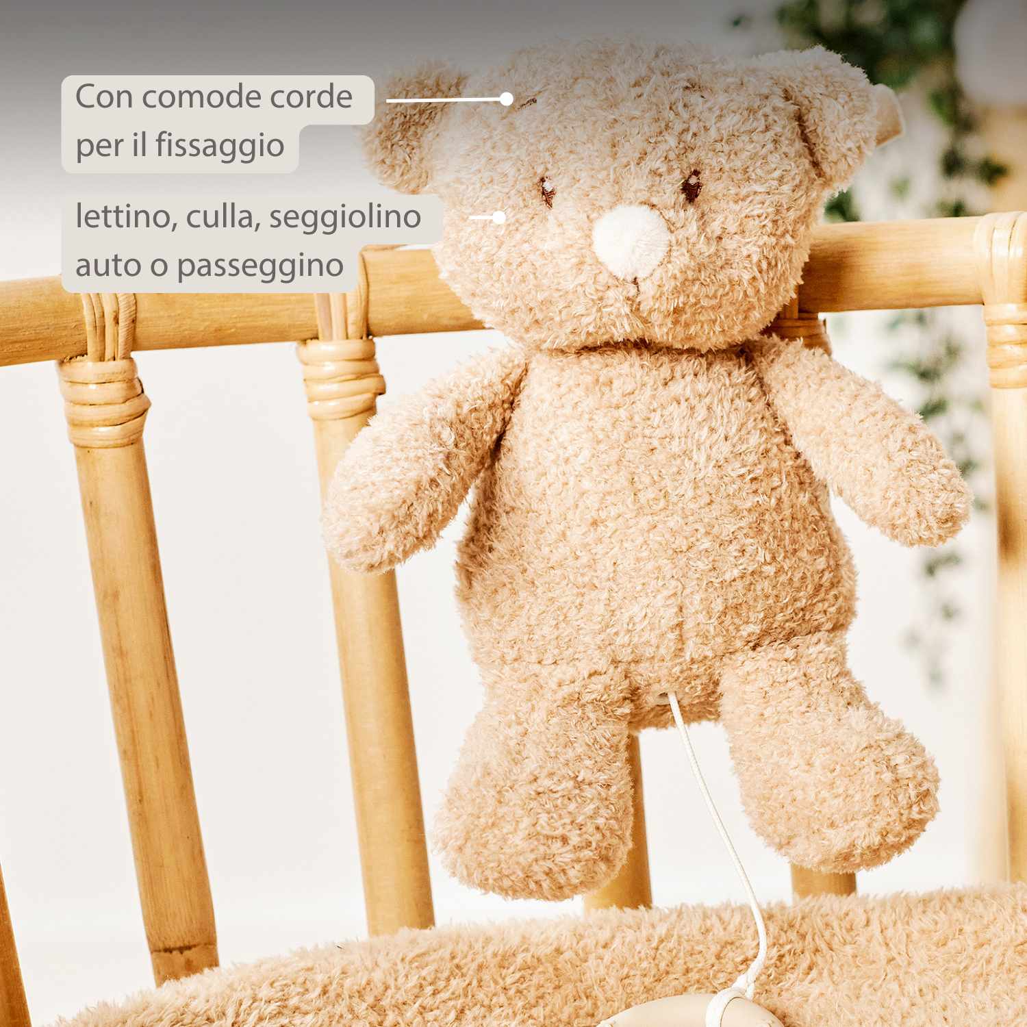 Il peluche musicale a forma di orso Nattou combina morbidezza, protezione e conforto. Con il musetto dolce e la forma coccolosa diventa presto l’amico preferito del tuo bambino. Tirando l’anello in silicone, la musica integrata suona la melodia calmante “La-Le-Lu”, perfetta per aiutare il bambino a rilassarsi o addormentarsi. I pratici cordini permettono di fissarlo facilmente a lettino, culla, box, seggiolino o passeggino. Un accessorio adorabile e un regalo perfetto.