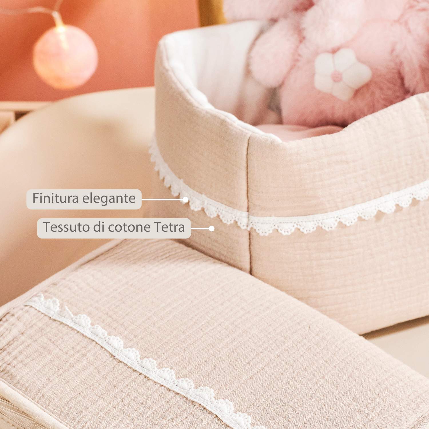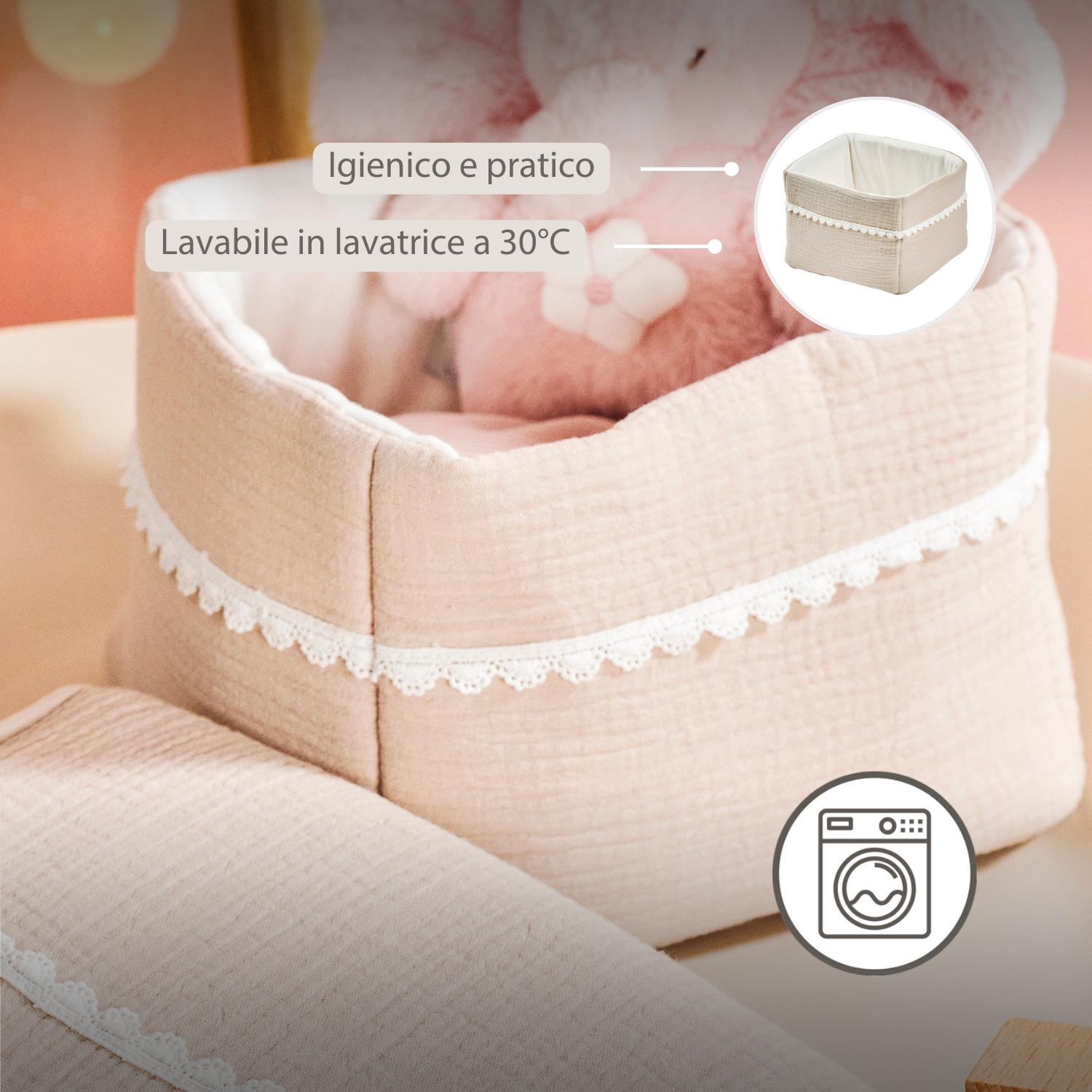 Il cesto Nattou in colore sabbia è una soluzione di archiviazione elegante e pratica per la cameretta o il bagno. Perfetto da posizionare accanto al fasciatoio o al bagnetto, per avere sempre pannolini, prodotti per la cura o giocattoli a portata di mano. Il cotone tetra morbido con rifiniture eleganti rende questo cesto non solo funzionale, ma anche un’aggiunta raffinata all’arredamento. Abbinabile ad altri accessori della collezione Fanfan.