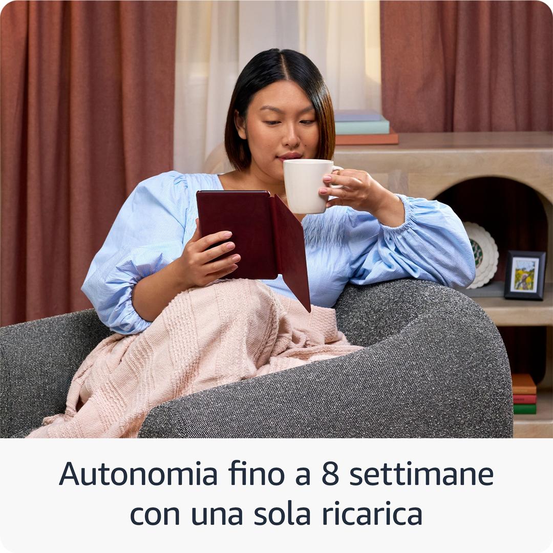 | Illustrazione | Leggi a colori: il nuovo schermo Colorsoft da 7’’, grazie al suo elevato contrasto, rende la lettura piacevole per gli occhi. Inoltre, i colori fedeli alla carta fanno risaltare al meglio la copertina e il contenuto del libro. Un'esperienza del tutto nuova: il display del Kindle Colorsoft è ottimizzato per la lettura a colori ed è diverso dal display del Kindle Paperwhite, che è ottimizzato per la lettura in bianco e nero. Colora le tue pagine: evidenzia le tue scene preferite in giallo, arancione, blu e rosa. Immergiti nella lettura: sul tuo Kindle non avrai distrazioni da social media, notifiche o altre app. Leggi con qualsiasi condizione di luce: regola la tonalità del colore dello schermo, da bianco ad ambra, per leggere comodamente sia al buio che in piena luce solare. Resistente all’acqua, per leggere in tranquillità: porta sempre con te le tue storie per leggere in piscina, nella vasca da bagno o in qualsiasi altro luogo. Utilizza la funzione Colore della pagina all'interno di un libro per passare da testo nero su sfondo bianco a testo chiaro su sfondo scuro. Pur essendo diversa dalla modalità Scura, consente una lettura più confortevole senza compromettere la resa dei colori nelle immagini e nelle copertine. Ampia selezione: accedi immediatamente a milioni di titoli nel Kindle Store. Con l’abbonamento a Kindle Unlimited, avrai accesso illimitato a un vasto catalogo ricco di best seller. |