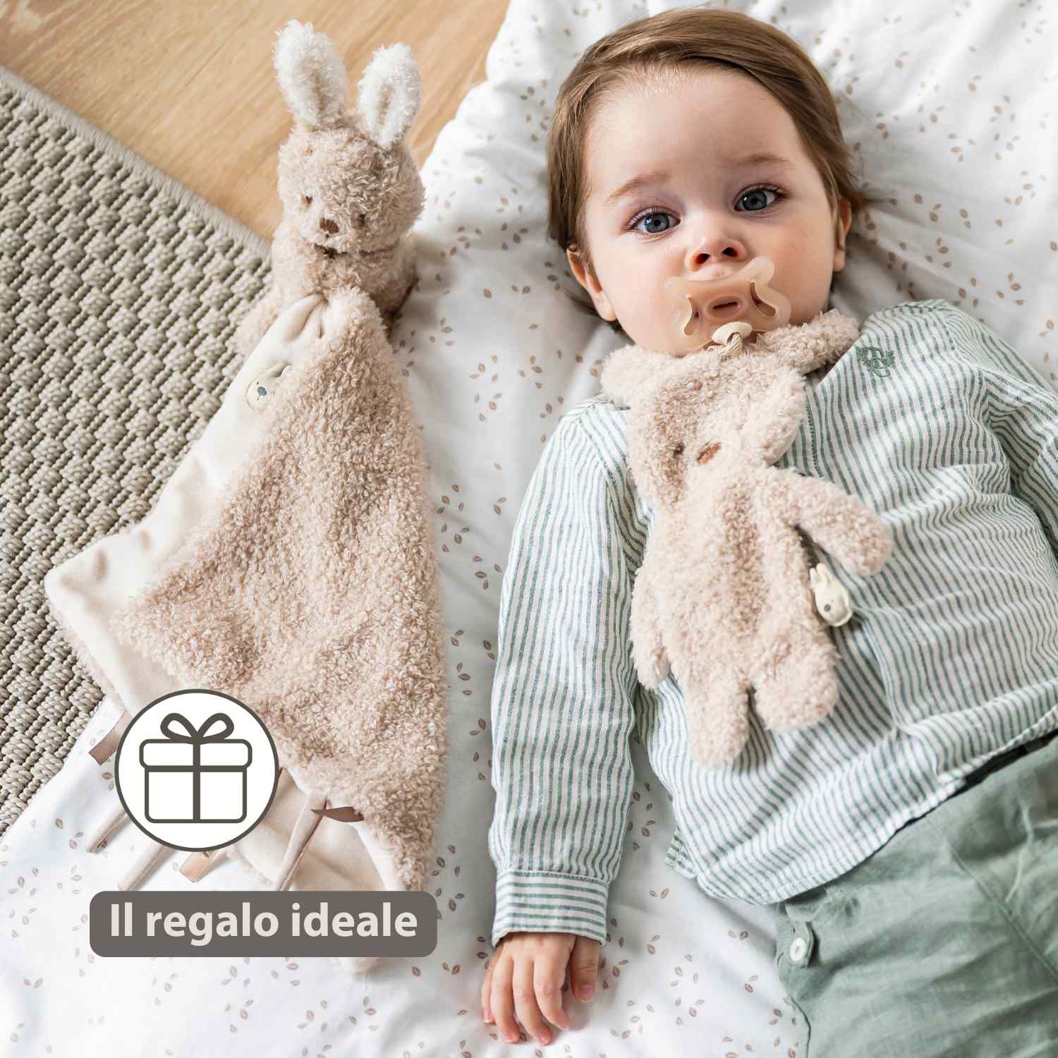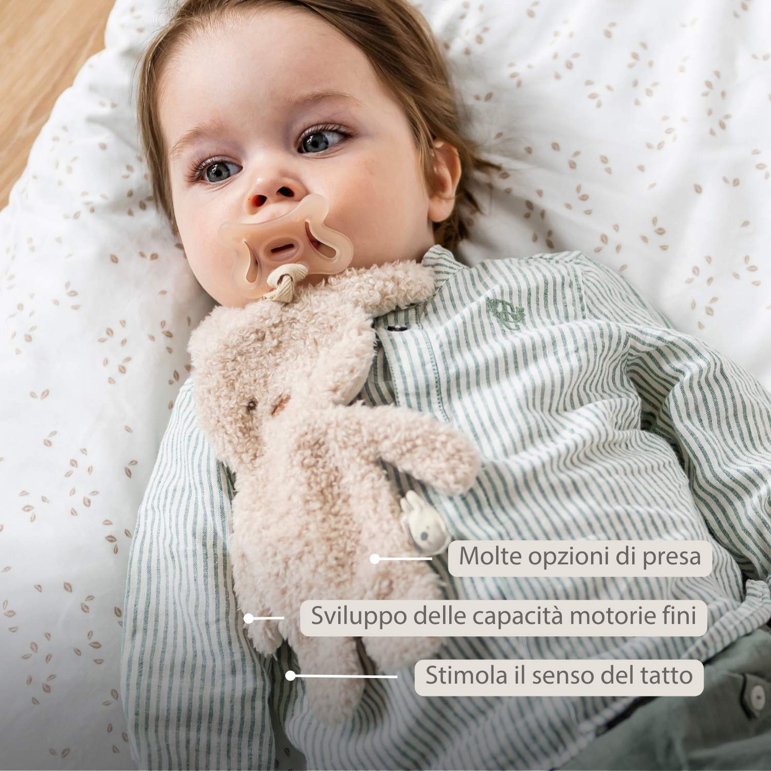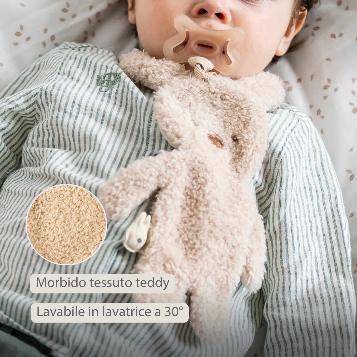 Il ciuccio con peluche a forma di coniglio Nattou in beige unisce morbidezza e funzionalità. Questo doudou con portaciuccio dà al bambino una sensazione di sicurezza grazie al velluto morbido e al tessuto teddy. Il pratico cordoncino mantiene il ciuccio sempre a portata di mano, evitando panico a casa o fuori. Compatto e leggero, ideale per le manine piccole e perfetto come regalo.