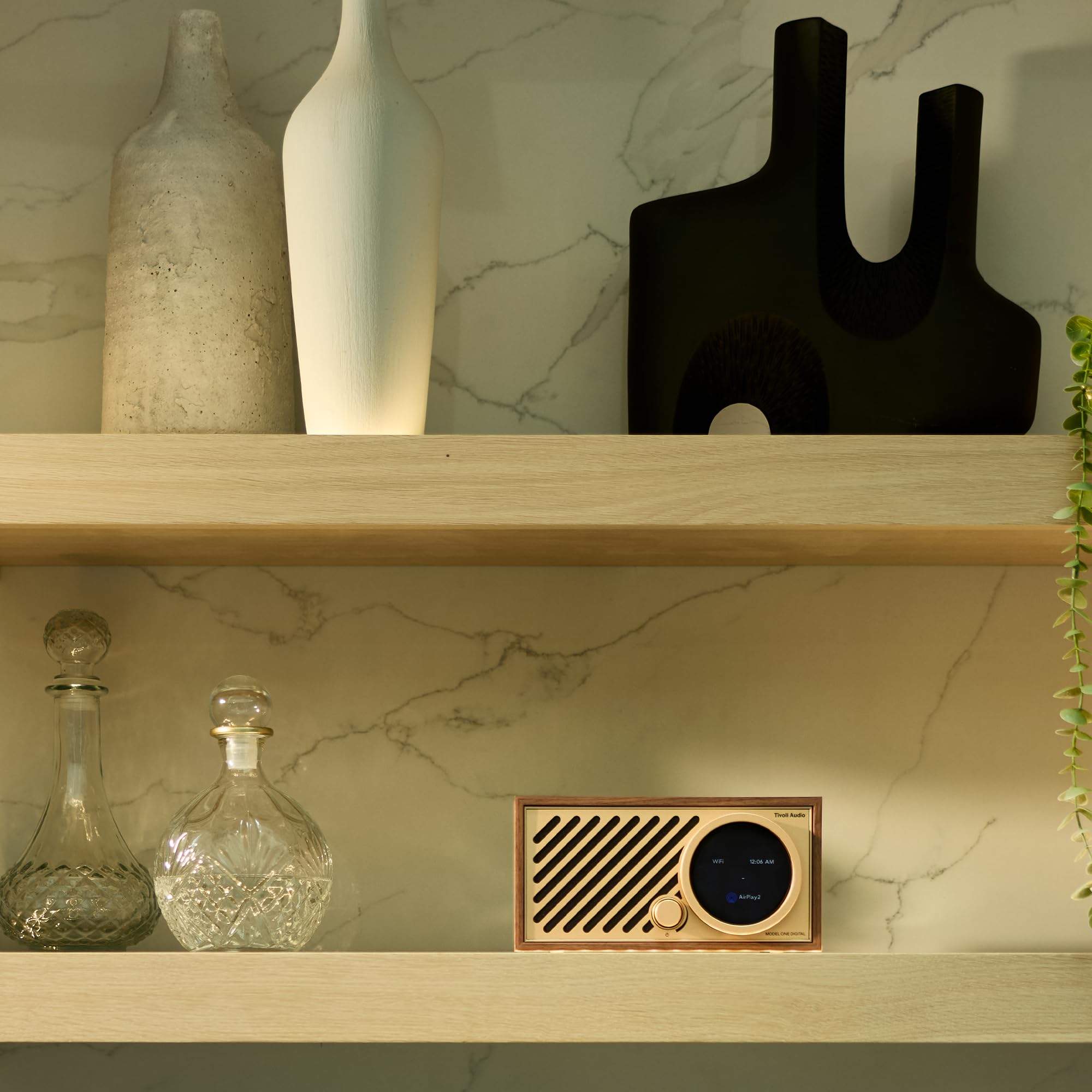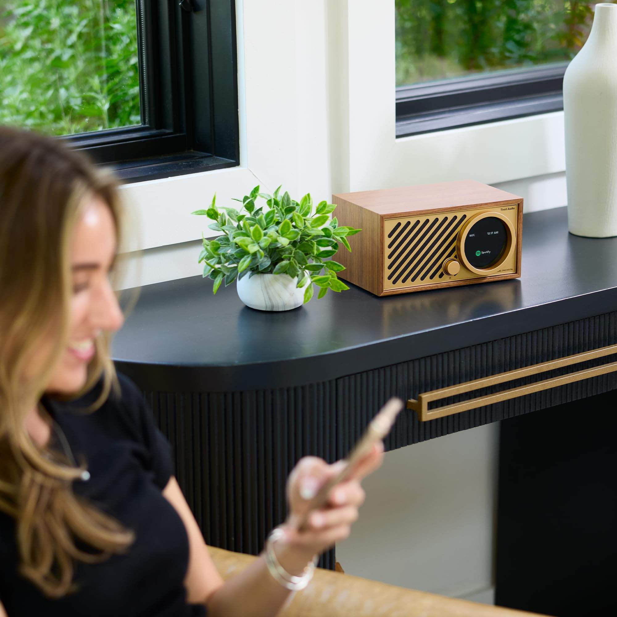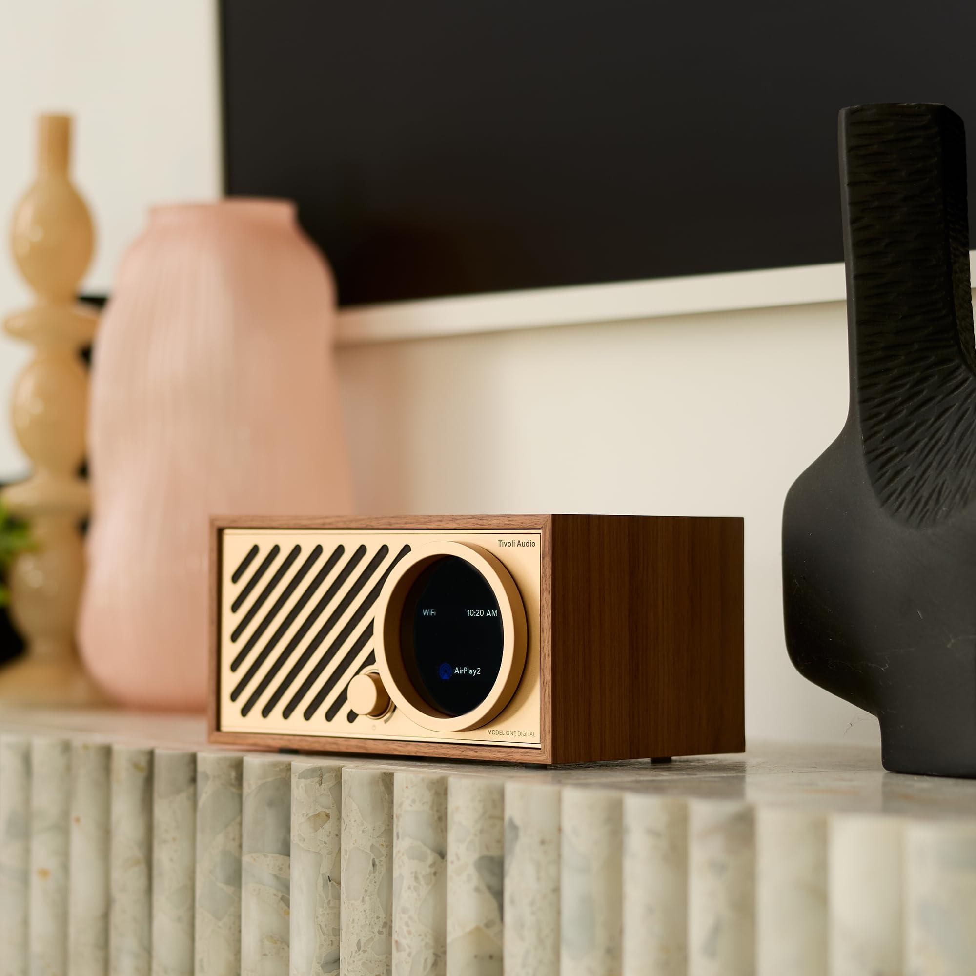 Scopri Tivoli Audio Model One, la radio FM digitale Wi-Fi e Bluetooth di terza generazione, un perfetto connubio tra design elegante e tecnologia avanzata. Con il suo raffinato colore noce/oro, questo dispositivo non solo arricchisce l'arredamento della tua casa, ma offre anche un'esperienza audio senza pari.