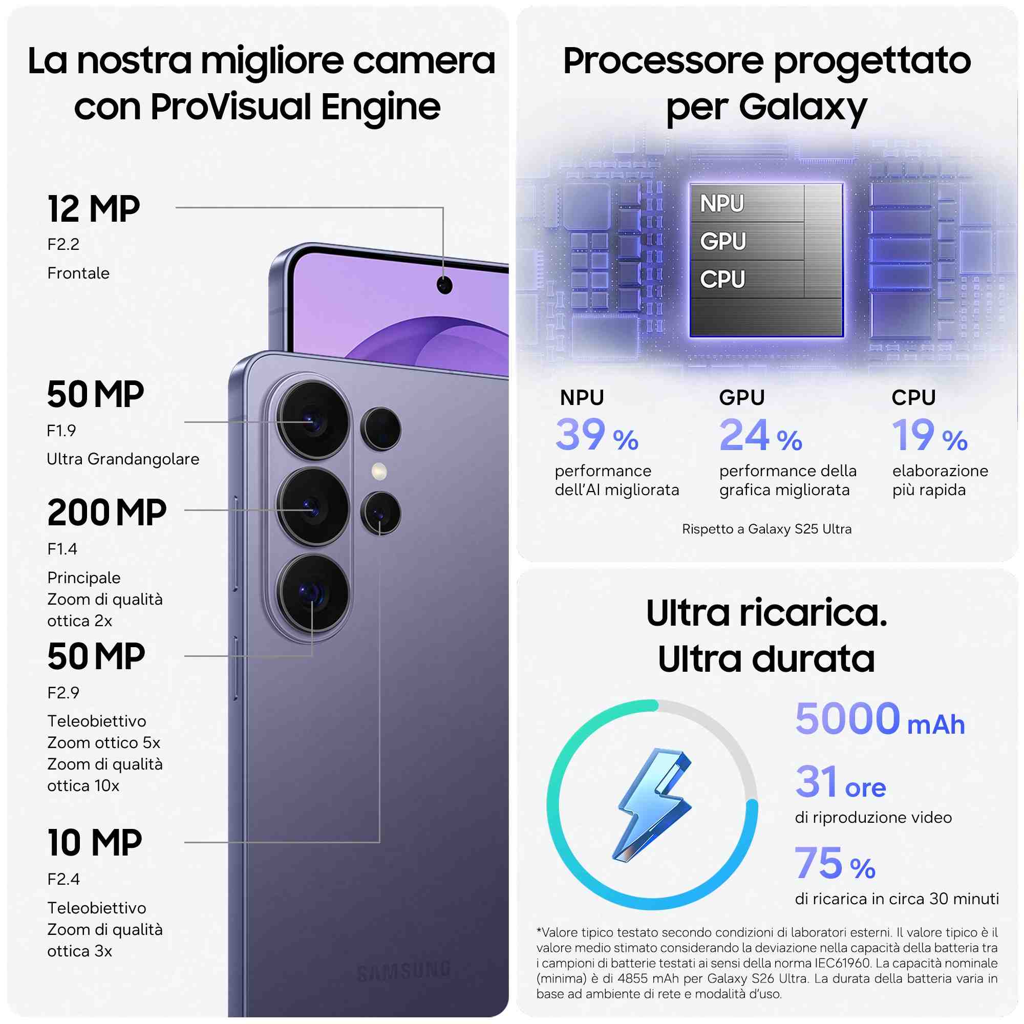 Altre caratteristiche fotocamera200 MP Grandangolare F1.4 50 MP Ultra grandangolare F1.9 50 MP Teleobiettivo 5x ottico F2.9 10 MP Teleobiettivo 3x ottico F1.9
