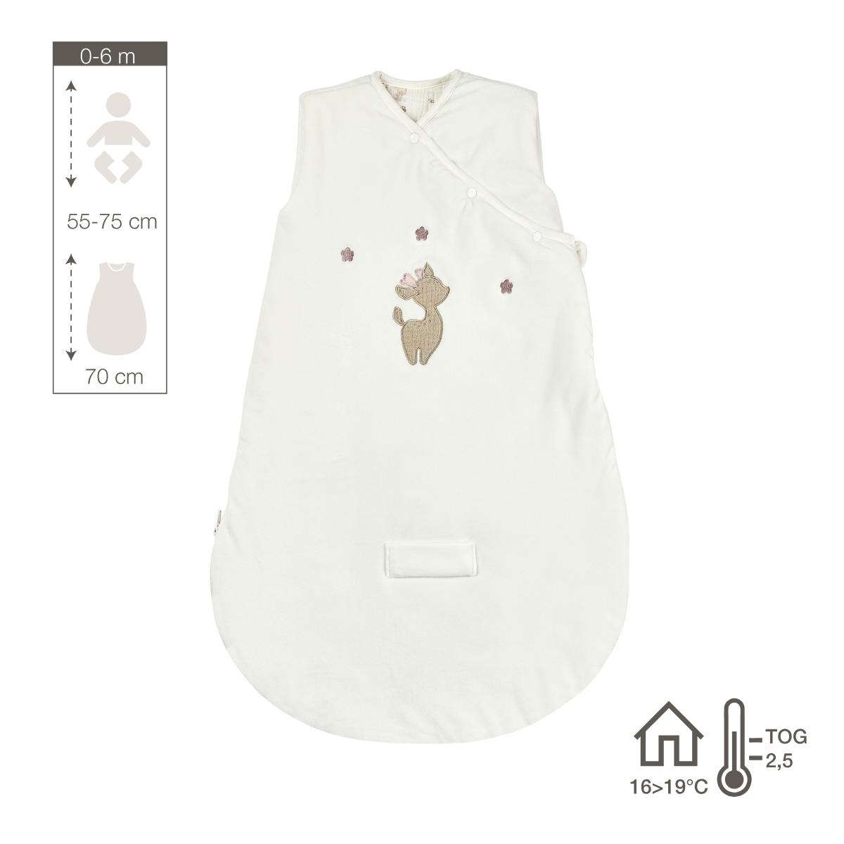 Il sacco nanna 70 cm di Nattou avvolge il tuo bambino in una morbida sensazione di protezione durante il sonno. L’esterno in velluto bianco lussuoso è piacevolissimo al tatto, mentre la fodera in cotone garantisce comfort traspirante e un ambiente sano per dormire. Con un valore TOG di 2,5, questo sacco nanna è ideale per temperature della stanza tra i 16 e i 20 °C. La cerniera laterale che si apre dal basso verso l’alto rende semplice il cambio e la cura, senza dover spogliare completamente il bambino. Inoltre, è dotato di un foro per l’imbracatura, per un utilizzo sicuro anche in auto. Una soluzione accogliente e pratica per neonati da 0 a 6 mesi.