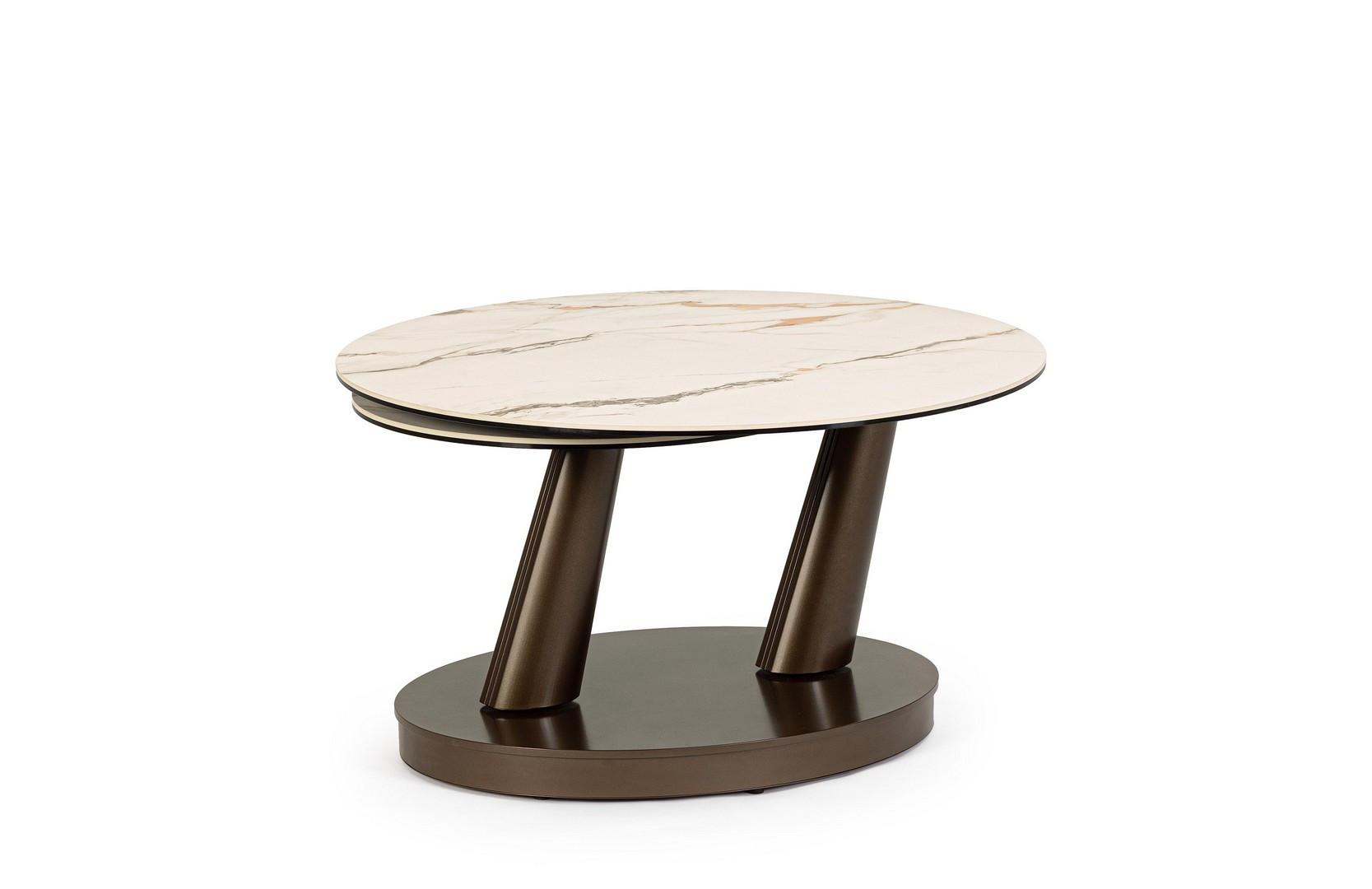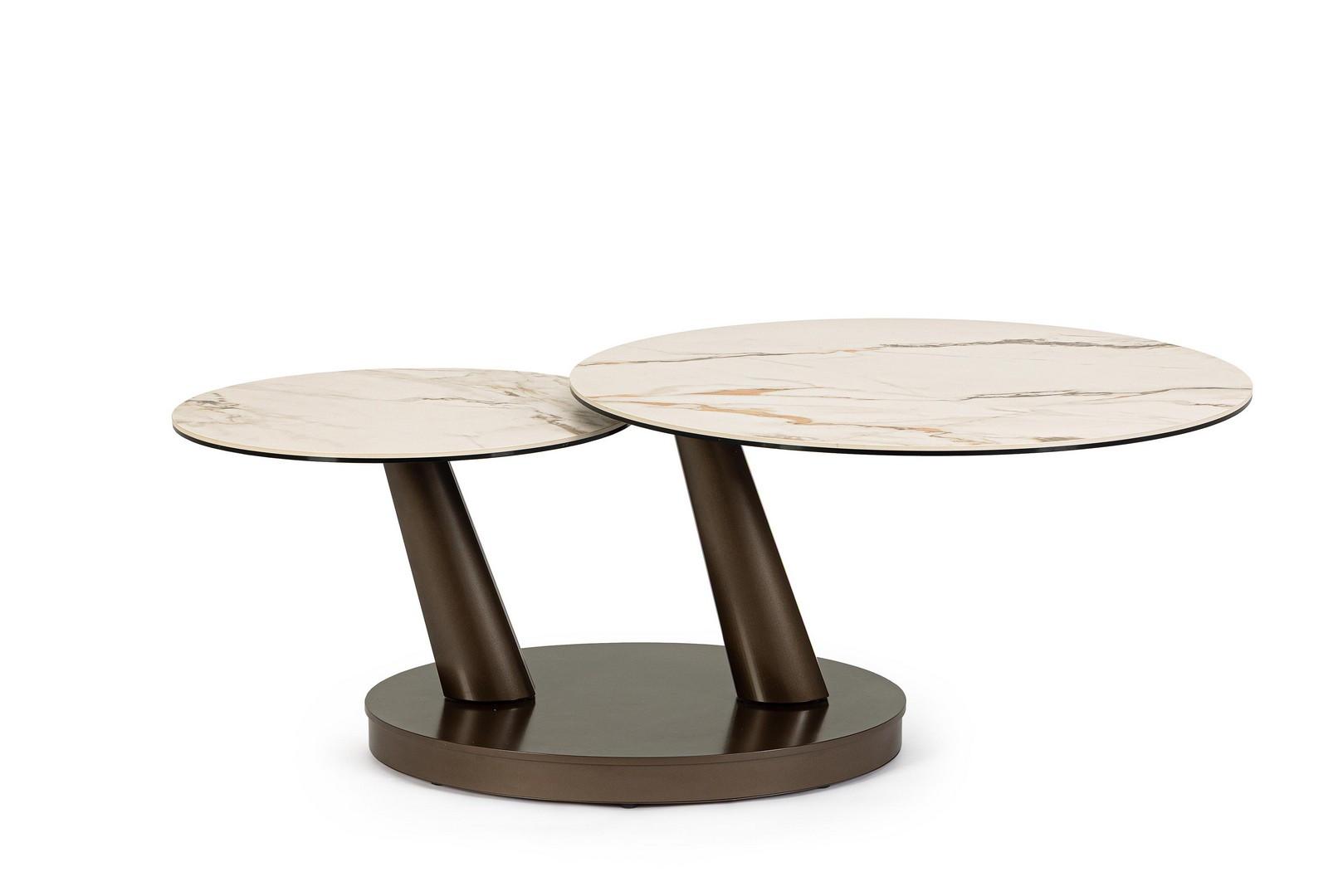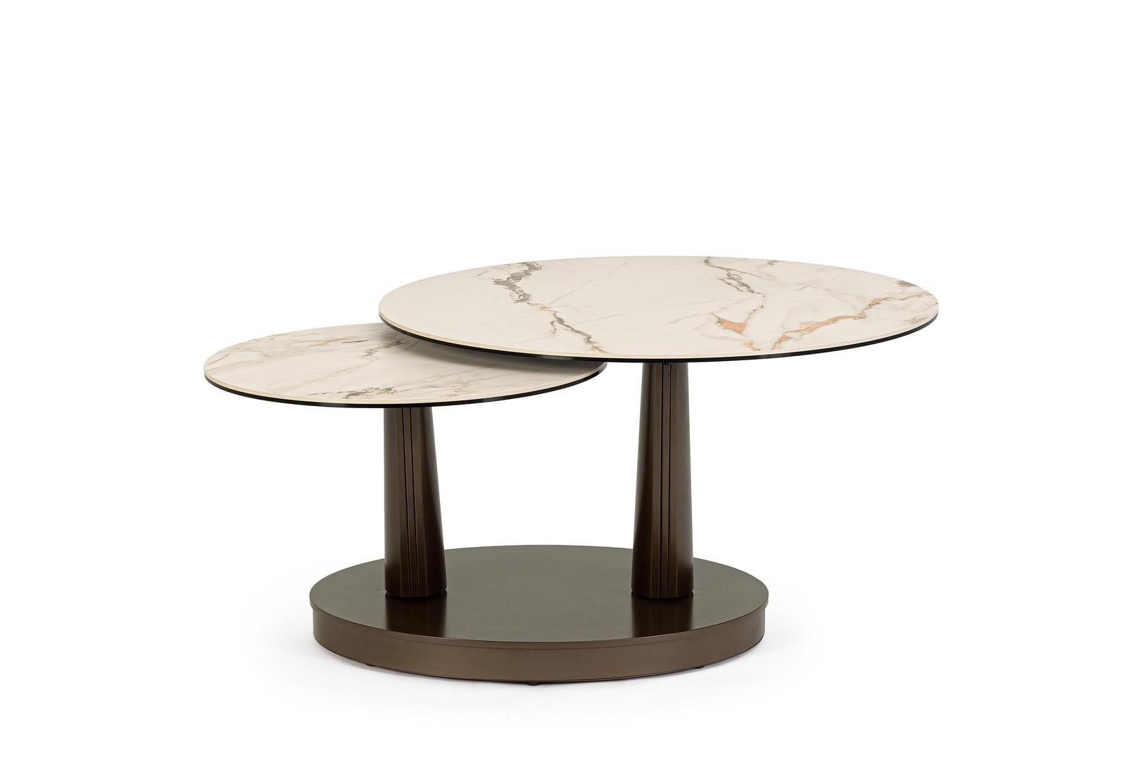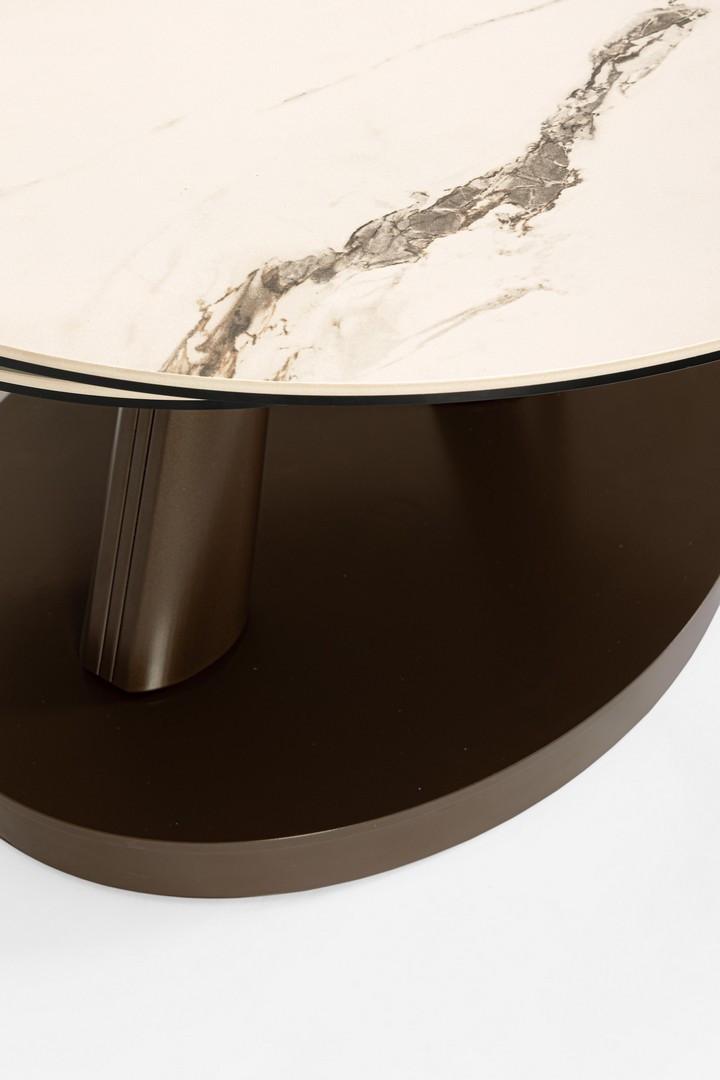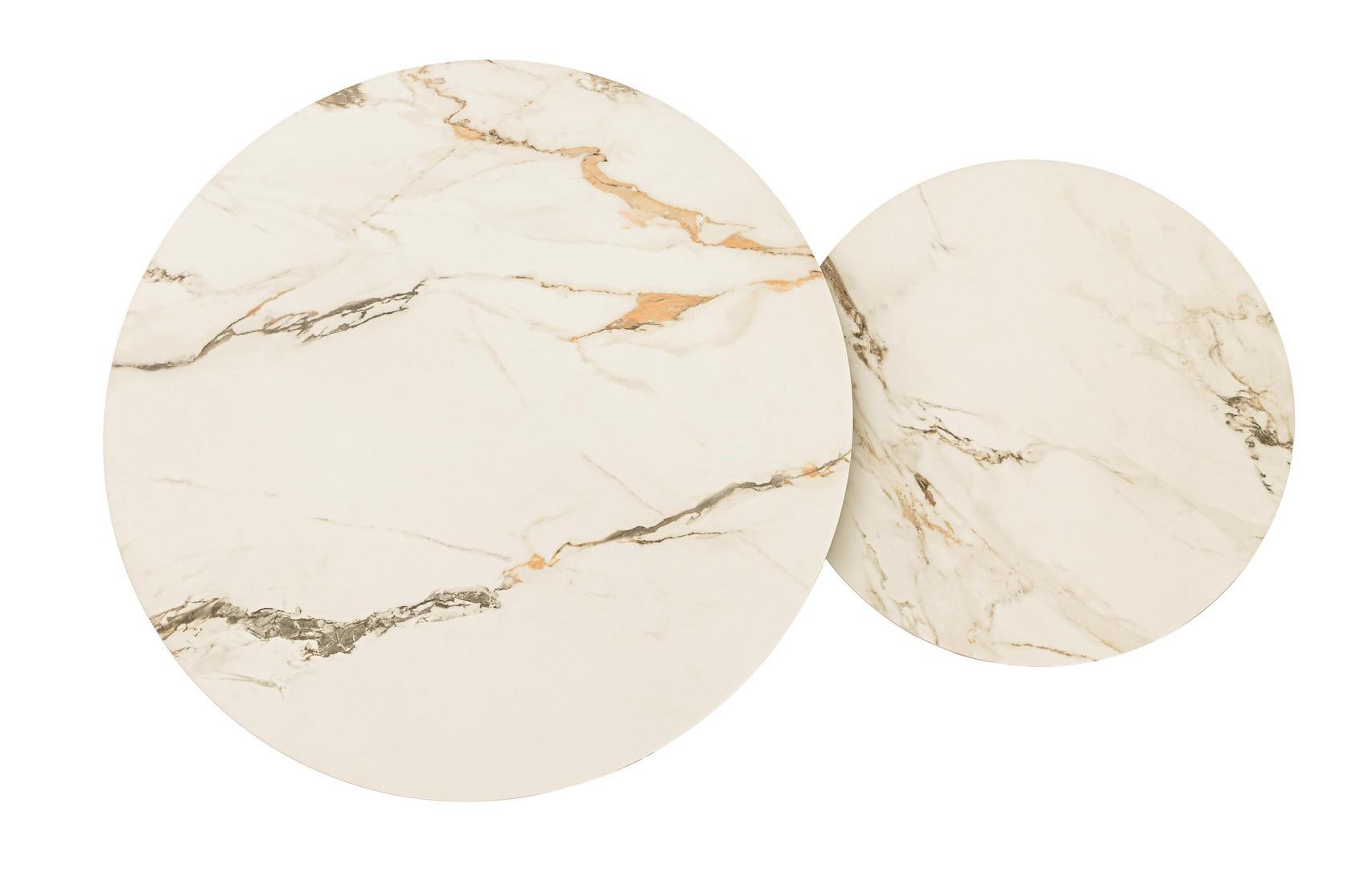 Base in acciaio verniciato a polvere epossidica. piano in gres porcellanato con effetto marmo e strato inferiore piano in vetro temperato. tavolino con piani sovrapponibili e apertura mediante rotazione. da assemblare.